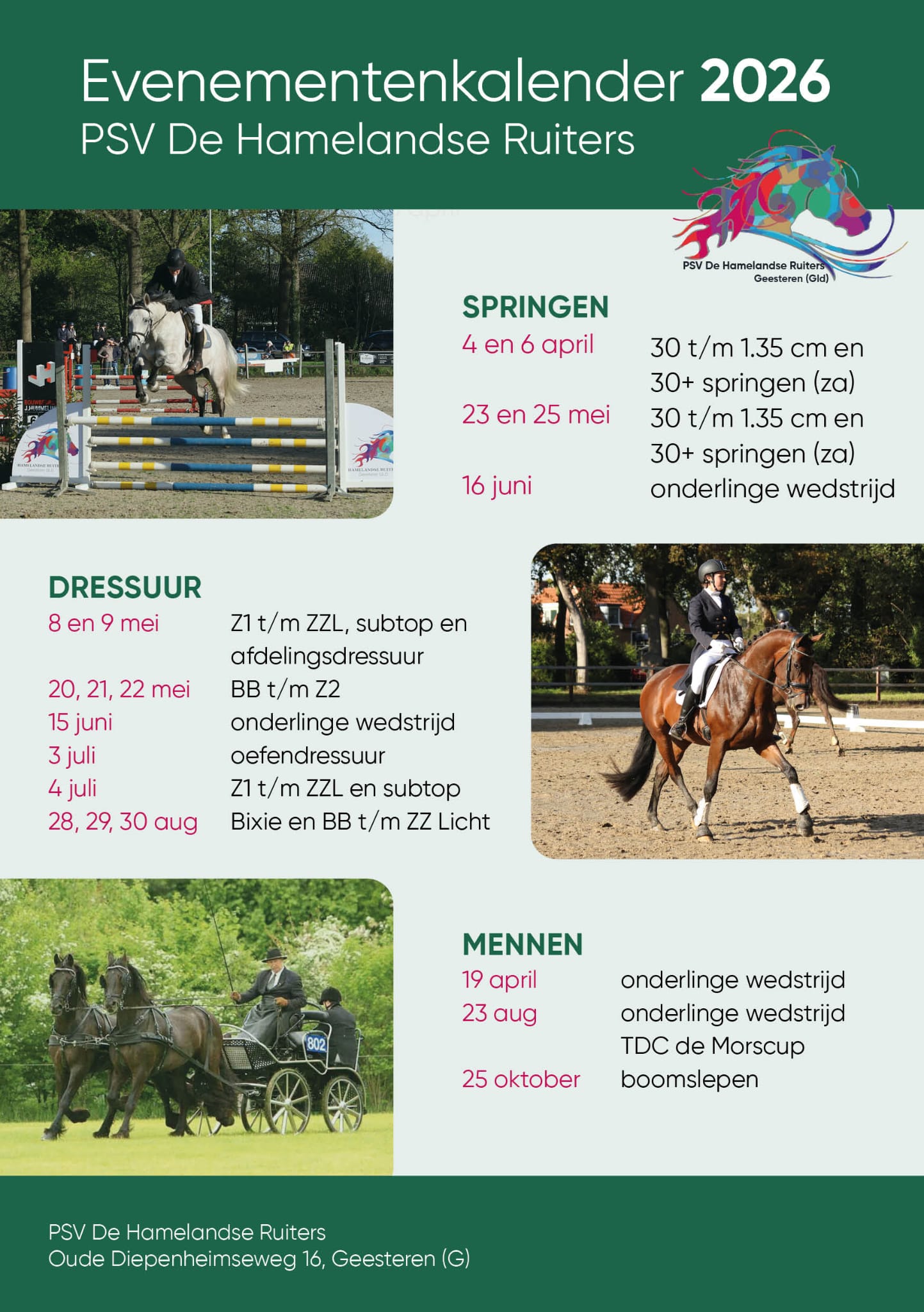 Er is weer een veelzijdige activiteitenlijst voor 2026 vastgesteld. In de poster op deze site en onder de menuknop “Agenda” zijn de plannen voor het komend jaar te vinden. Er is ruime keuze in mogelijkheden voor springen, dressuur en mennen