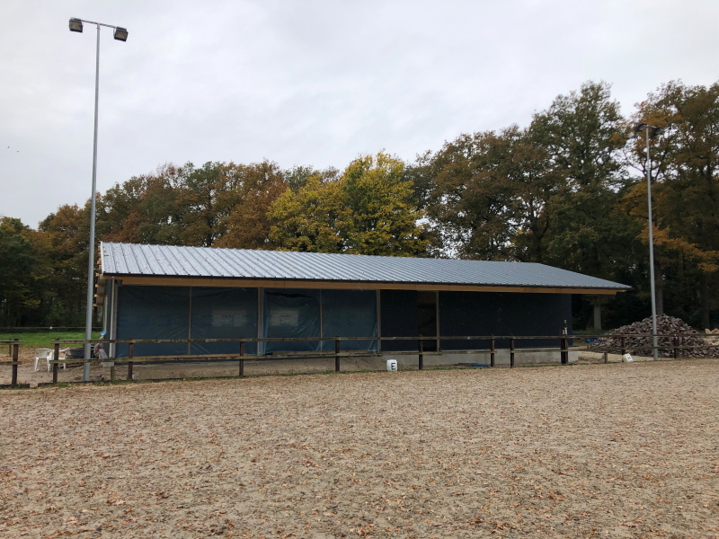 Alle wandplaten zijn bevestigd, het dak is dicht en de betonvloer van het kantinegedeelte is inmiddels gestort. Nadat het beton voldoende uitgehard is, wordt ook al een begin gemaakt met het plaatsen van de binnenwanden.