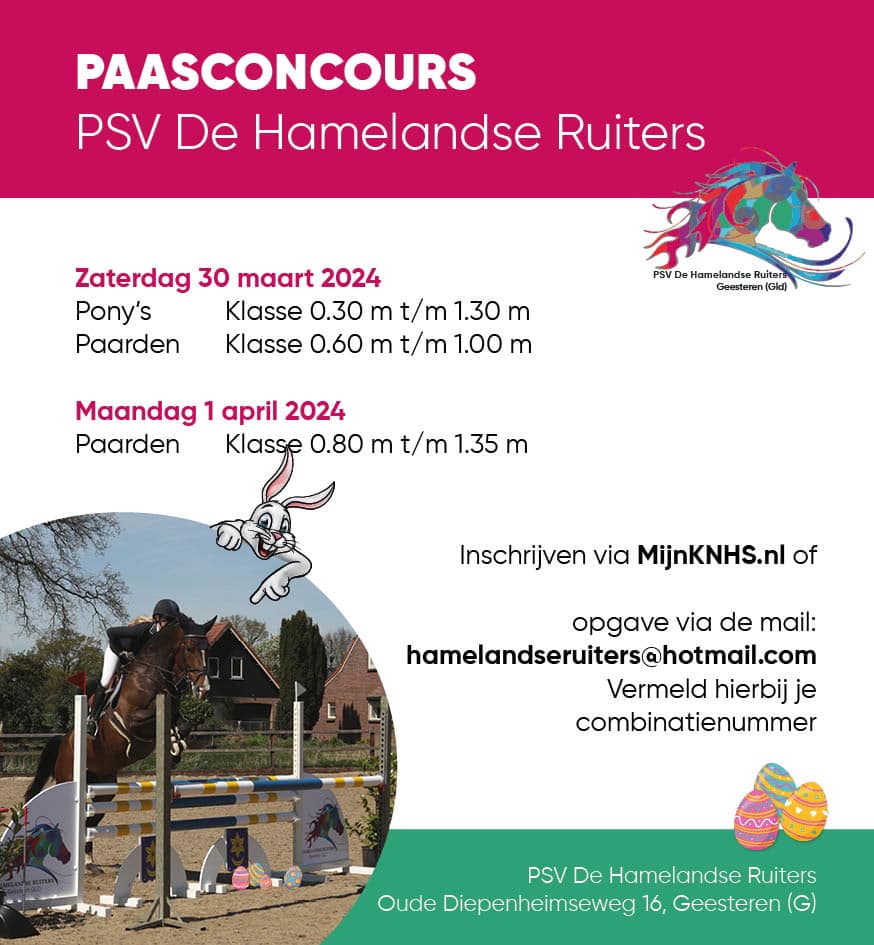 Het paasweekend staat weer voor de deur en je weet wat dat betekend, het paasconcours van de Hamelandse ruiters. Op 8 & 10 april organiseren we weer een springwedstrijd. Zaterdag 8 april trappen we af met de pony’s 0.30m t/m 1.25m. Waarna de paarden 0.60m t/m 1.00m volgen. En we…